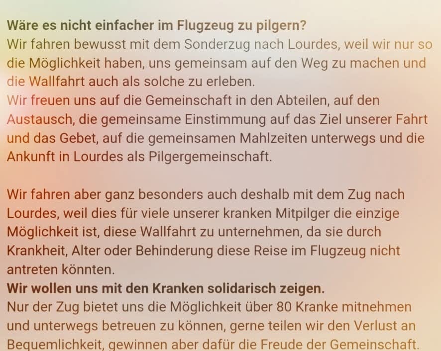 Wir sind kein Verein! Wir sind ein großer Freundeskreis von Menschen, die die Wallfahrt nach Lourdes schätzen, und offen für alle Interessierten Bundesweit und Weltweit sind. Unser Engagement gilt besonders dem Erhalt und der Förderung der Fahrten im Sonderzug und im Lazarettwagen nach Lourdes und der Freude in der Gemeinschaft. Wir möchten auf diese wichtige Möglichkeit der Teilhabe aufmerksam machen. Marion Müller-Praschma brachte es auf den Punkt: